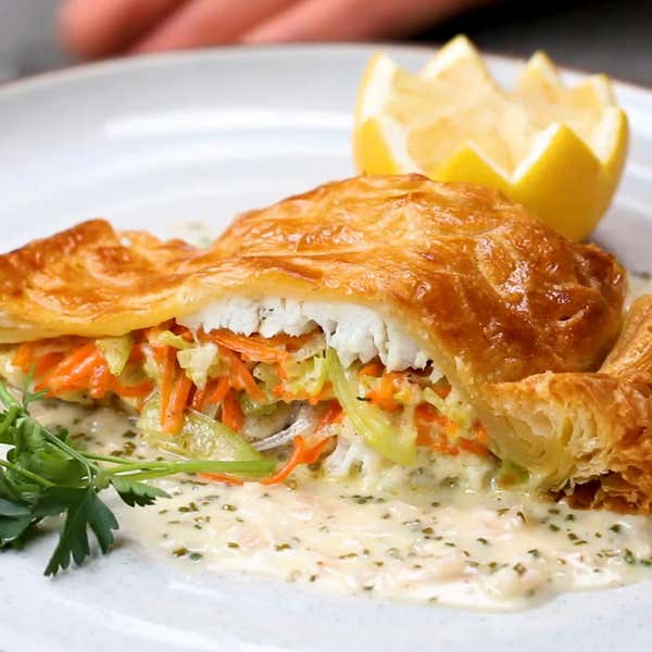 Salmon Wellington Little Sunny Kitchen - Crispy and flaky on the outside, served with a tangy and creamy sauce.