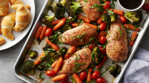 Balsamic Chicken & Veggies Balsamic Chicken & Veggies - Bake for 25 minutes, until a thermometer inserted in center of chicken reads 165ºf and vegetables are fork tender.