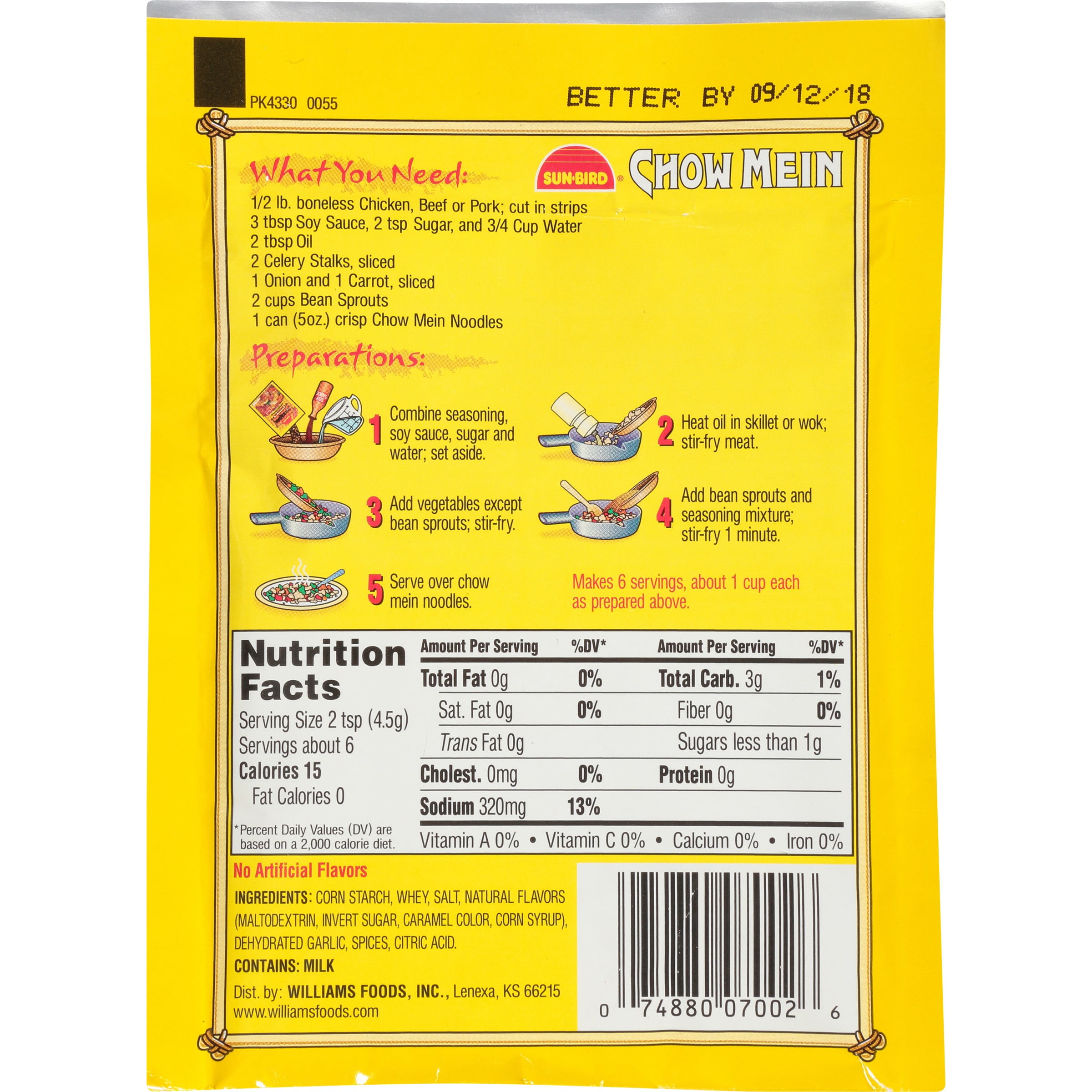 Sun Bird Chow Mein Seasoning Mix 1 Oz Packet Walmart Com Walmart Com - Chow mein noodles are fried to crispness while lo mein noodles are boiled to softness.