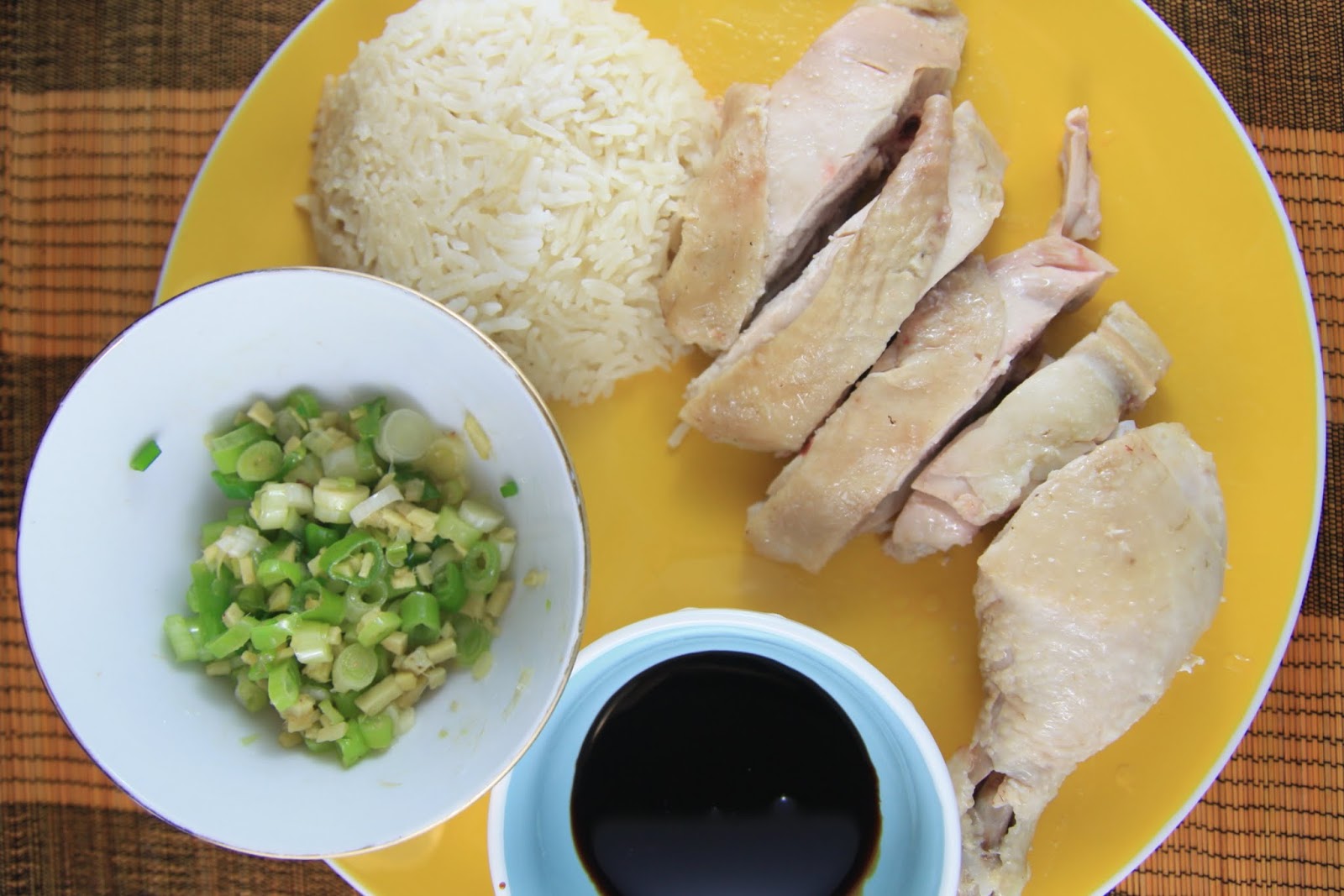 Hainanese Chicken Rice Cơm Ga Hải Nam Plated Palate - The chicken is poached and then the rice cooked in the broth.