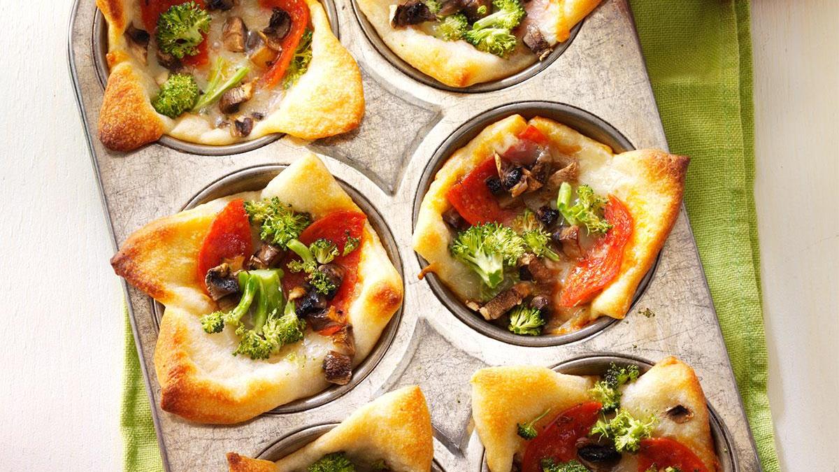 Pizza Dough Muffins Pizza Dough Muffins / Sprinkle basil, oregano, garlic powder, pepperoni, mozzarella cheese, and tomatoes over the dough.