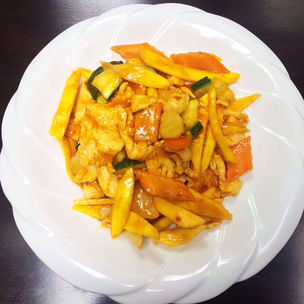 Thai Spicy Mango Chicken Thai Spicy Mango Chicken : + coconut mango chicken lightly stir fried chicken with slices of fresh mangoes, coconut milk and assorted vegetables.